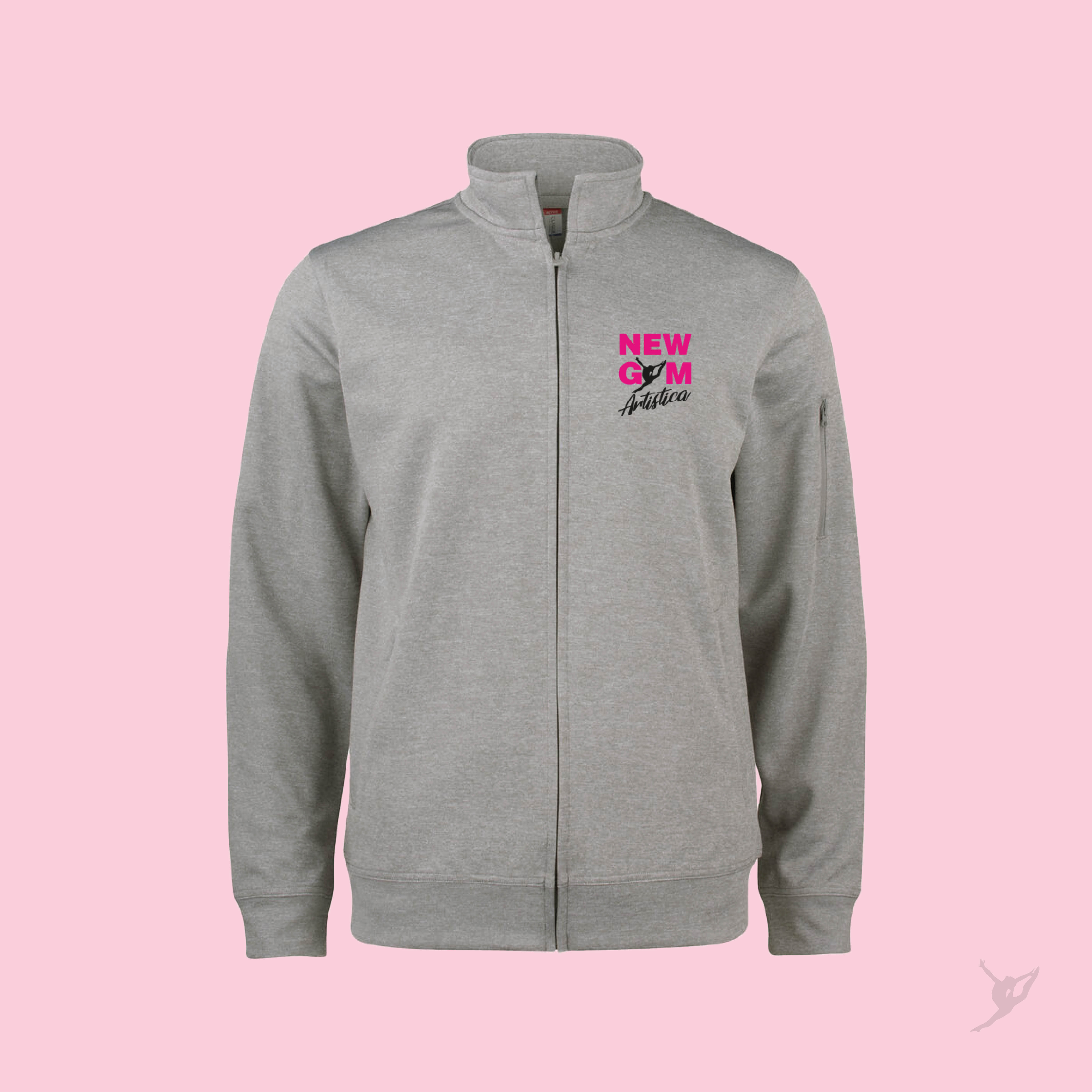 Felpa cardigan in tessuto tecnico a collo altro con zip intera e tasche laterali. Tessuto elasticizzato non garzato. Tasche con zip e asole per auricolari. Solo nella versione da adulto, taschino con zip sulla manica. Cerniere tono su tono; 100% poliestere_280 g/m².